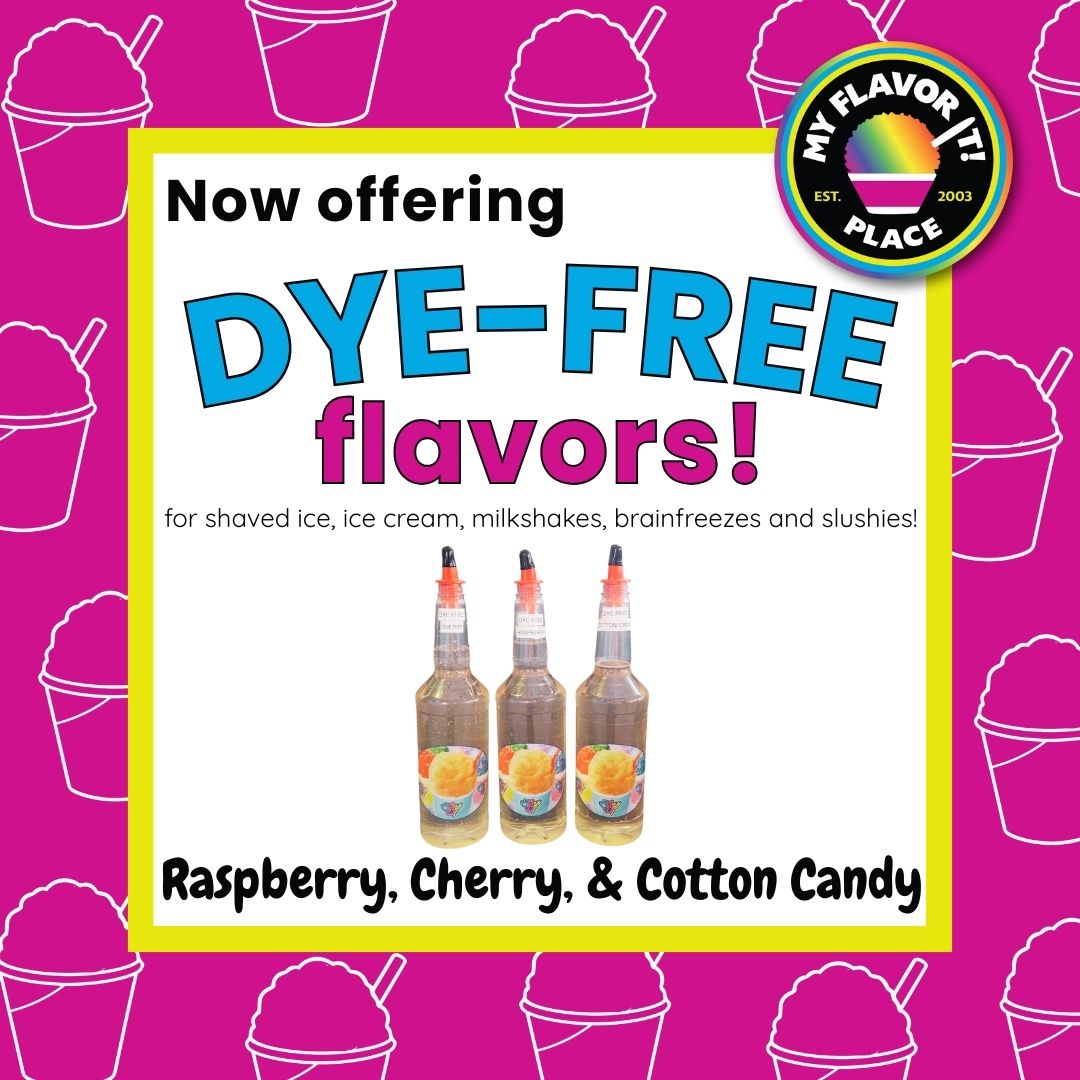 At My Flavor It! Place, we shave each handmade creation to order. Our syrups are made in-house using 100% Cane Sugar. We also offer Sugar Free options. You can choose up to 3 flavors! If you’re feeling adventurous, try a Volcano Ice (comes with ice cream on bottom and top), add cream topping, or add your favorite candy!
